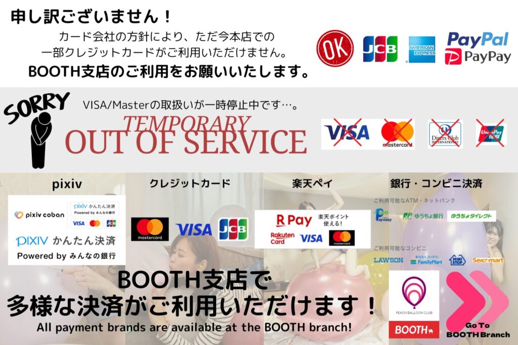 復旧するまでBOOTH支店のご利用をお願いいたします。(JCBカード、AMEX、Paypal Invoice、Paypay送金は利用可能です)