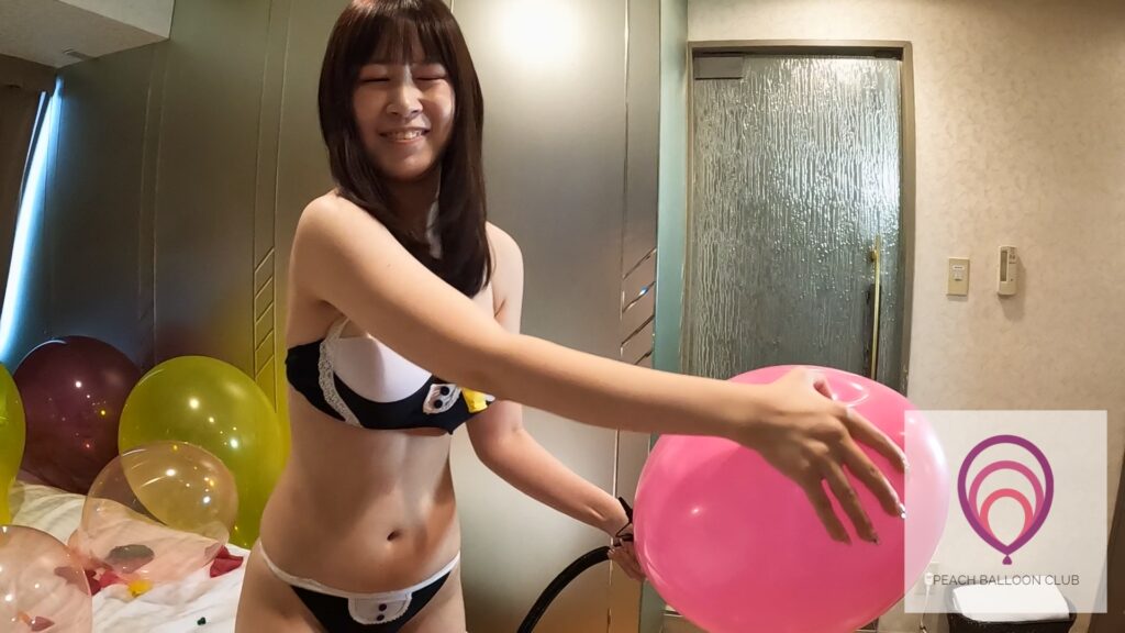 たくさんの風船に囲まれて楽しそうな りんか さん。風船たちを優しく撫でて愛でながら、素敵な笑顔を見せてくれます。だけどリラックスした雰囲気は突然変わって、すぐに本気の”風船割り”モードに入るりんかさん。時々少し怖そうな表情や緊張した表情をしながらも、容赦なく風船を割ろうとします。