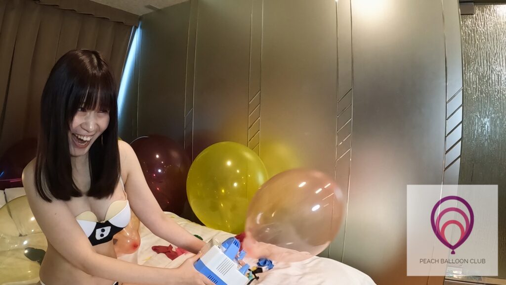 「ピーチバルーンクラブ#13-2 りんかと膨らむ風船 (Rinka and inflating balloons)」では、りんかさんがポンプを使って風船を割れるまで膨らましてくれます。